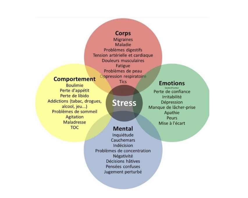 Attention : pour soulager le malaise causé par le stress, certains comportements compensatoires se mettent en place : tabagisme, alcoolisme, dépendance aux drogues, excès de sport, manque/excès de sommeil, isolement…Ces mécanismes compensatoires font peut-être oublier temporairement le stress mais ne le règlent pas, voire peuvent aggraver la situation. Et de nouveaux problèmes peuvent apparaitre.
