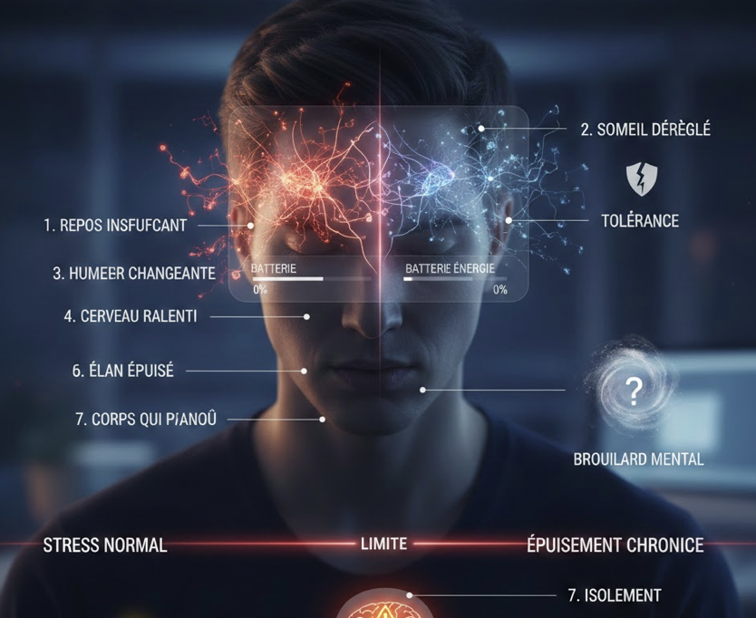 1️⃣Le repos ne suffit plus : une fatigue physique/psychique et cela dés le réveil, et qui perdure même après un week-end, une grasse matinée ou des vacances car le système nerveux reste en alerte